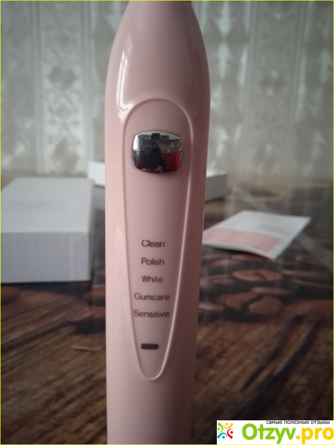 Переключаются режими нажатием кнопки, которая также служит кнопкой включения и выключения устройства. Короткое нажатие на кнопку и щетка включается, загорается зеленая лампочка на выбранном режиме. Дальнейшее короткое нажатие кнопки переключает режимы. Чтобы выключить, нужно удерживать кнопку. Все режимы работают 2 минуты с интервалами в 30 секунд. Разница в силе вибрации, с импульсами и без. Первый режим - clean - простая чистка. Второй режим -polish - полировка (работает пульсирующими движениями). Третий режим - white - отбеливание. Четвертый режим - gumcare - уход за деснами (пульсирующий). Пятый режим - sensitive - для чувствительных зубов. Когда аккумулятор разрядится, загорается красная лампочка и щетка выключается.