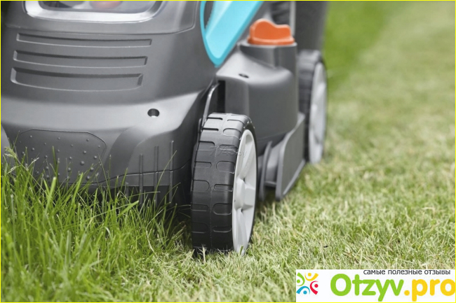 Травосборник комбинированный, благодаря пропуску влаги в нем отсутствуют пустоты. Есть индикатор, который сигнализирует о наполненности мешка. Задние колеса довольно массивные, они составляют основную массу агрегата. Передние колесики небольшие и способствуют маневренности. Корпус не пластиковый, а из нержавеющей стали.