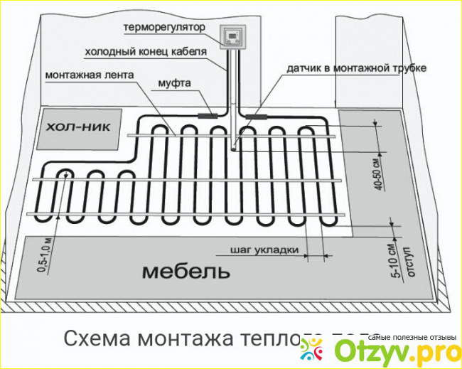 На пол крепится специальная стяжка, на которую зигзагом наматывается кабель.