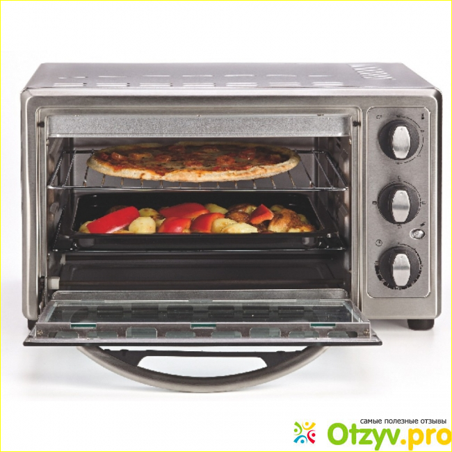 Что касается технических характеристик, то тут, думаю, достаточно будет указать лишь несколько основных параметров: объем 21 литр, мощность 1300 Вт и способность нагрева до 230 градусов. Все это обеспечивает высокую эффективность мини-печки и дает возможность приготовить великое разнообразие кулинарных блюд.