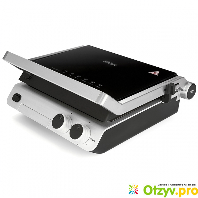 Есть два термостата, их сразу видно на фото. Ручки большие, можно поворачивать с лёгкостью, не скользят в руке. Одна сделана для регулировки температурного режима, а вот другой выставляет таймер. Готовить с таймером вообще отлично. Не приходится быть привязанным к готовке. Можно выставить время приготовления, и лечь спать. Еда готовится, и он выключается. Останется лишь потом снять. Да и теплым остаётся. В то же время не подсушивается сверх меры. Таймер можно выставить максимум на 30 минут, для меня этого вполне достаточно. Другая ручка служит для выставления температурного режима. Имеется 3 режима, и четвертый это максимум. Максимум достигается при температуре в 320 градусов. В основном им и пользуюсь, хотя могу поставить и на уровень ниже. Жарить с его помощью удобно, так как гриль открывается на 180 градусов. Можно готовить как на одной стороне, так и сразу на двух, или при закрытом варианте.