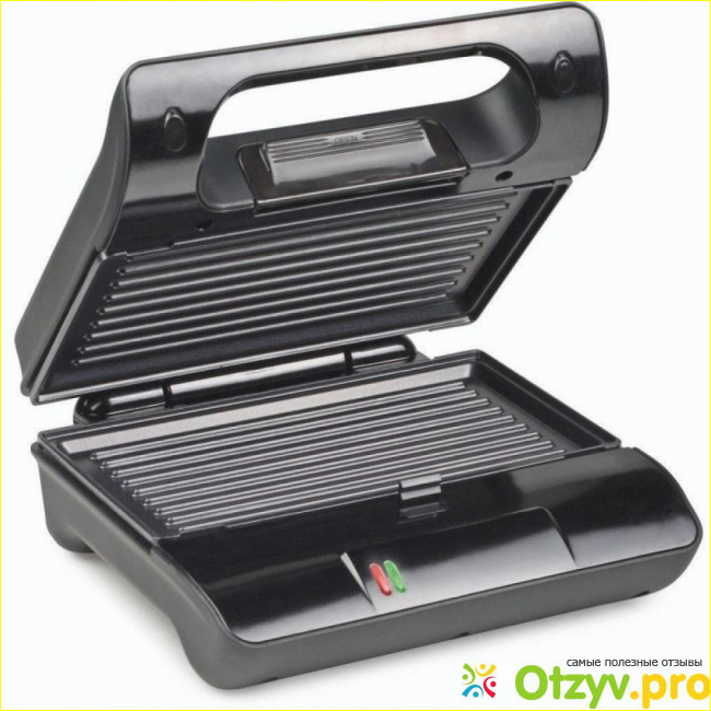 На нижней части модели находятся два индикатора. Одни из них горит красным, а другой зеленым цветом. Когда прибор включен, то загорается сперва красная лампочка. Когда же модель хорошо разогрелась и готова к работе, то сразу загорается зеленая лампочка. Это говорит о том, что на пластины можно выкладывать продукты.