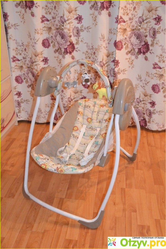 Качеля оснащена 5-точечными ремнями безопасности, сами ремни и застежки довольно крепкие, за весь период эксплуатации ни разу не рвались и не ломались (на других приспособлениях застежки у нас ломались). Регулируется по углу наклона. Для совсем маленького ребенка, который не умеет сидеть, необходимо спинку опустить в самое нижнее положение, лежа. Получается все равно не совсем лежа, но угол наклона получается менее 45 градусов, он допустим. Чехол мякгий, ребенку лежать комфортно. Можно включить музыку. Когда ребенок подрастет, он начинает интересоваться подвешенными игрушками, смотреть на них, тянуться. Для разнообразия игрушки лучше менять, только выбирать из своих очень легкие маленькие безопасные игрушки, так как от тяжелых дуга может открепиться и упасть.