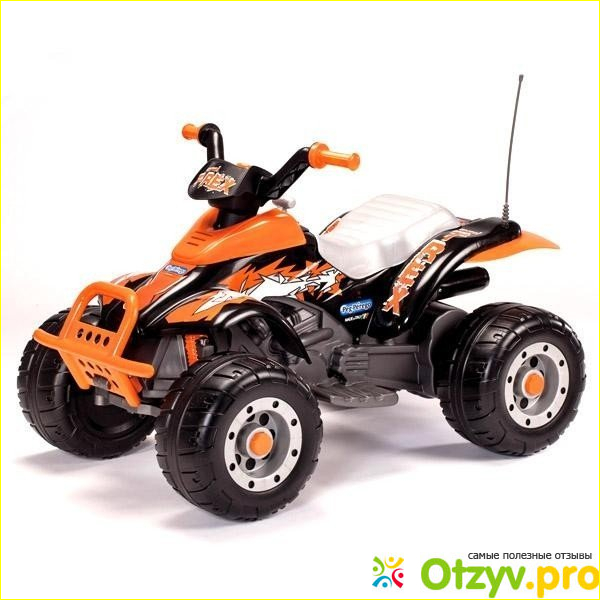 Данная модель прежде всего привлекает к себе свои дизайном. Сочетания черного и оранжевого, символизирующего пламя, цветов сразу создает ощущение скорости и драйва. По крайней мере, мальчики точно оценят. Хотя я, будучи все-таки девочкой, тоже в большом восторге от такой расцветки). У данного квадрацикла очень удобное питание от батареи на двенадцать вольт. Кроме того, большие колеса создают безопасное расстояние до земли, так что переживать за безопасность малыша практически не приходится.