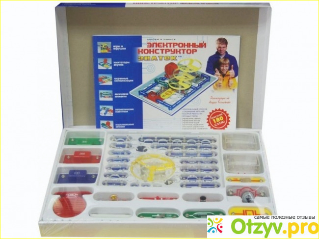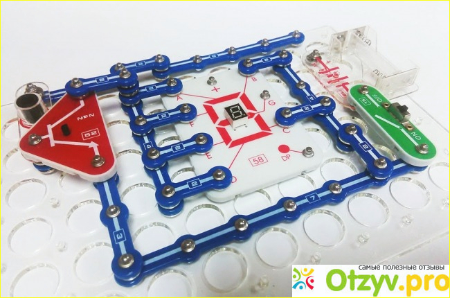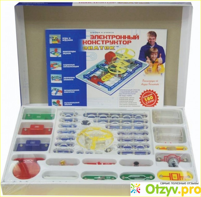 В данном же наборе вы найдете 35 различных деталей из которых ребенок сможет самостоятельно уже к семи года собрать целых 180 различных схем. Только представьте сколько всего интересно ребенок узнает из этого электронного конструктора.