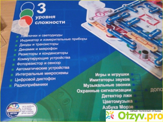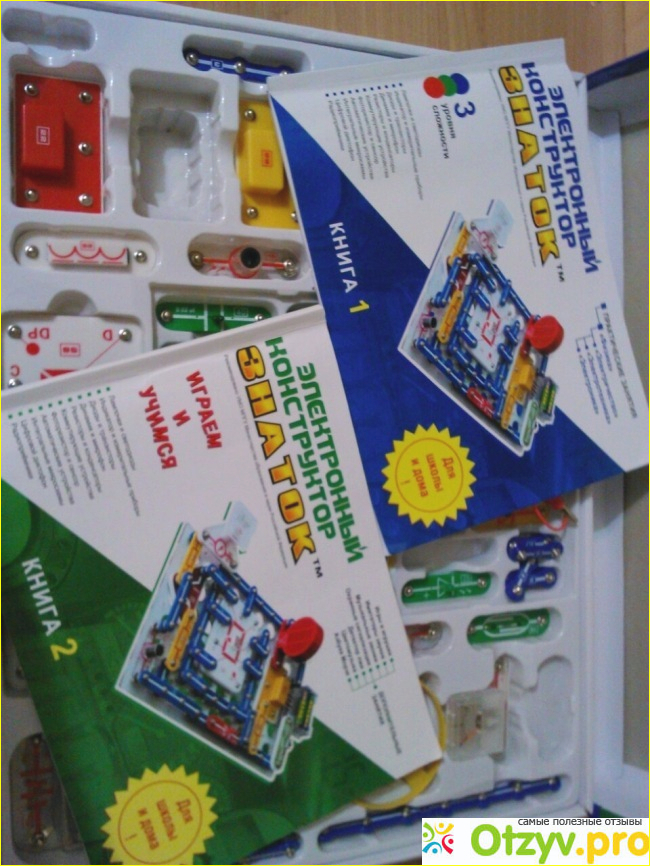 Конструктор содержит две книги: одну с практическими занятиями, вторую со схемами. Практические занятия согласуются со школьной программой 8-11 класса, и это ещё один аргумент в пользу того, что для 5 лет этот конструктор не подойдет. Из минусов могу отметить то, что негде купить запасные или перегоревшие, сломавшиеся детали. Лампочки, которые перегорели, мы найти по городу не смогли. Перегоревший блок я пыталась найти в интернете, и на сайте Знатока, но не нашла. Но в общем и целом, конструктор очень интересный и познавательный, детям старше 7 лет можно купить 180 или 320 схем, он и по цене будет дешевле. Свой мы покупали за 3300р.