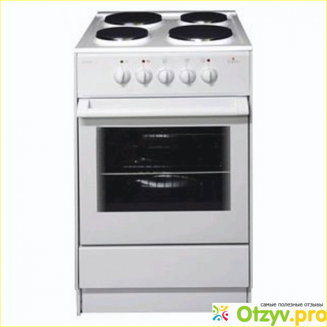 Это полностью электрическая плита белого цвета, с четырьмя конфорками. Духовка такая же большая - 50 л. В данной модели нет подсветки духовки, нет блокировки дверцы. Эта модель легче предыдущей, весит 30 кг.