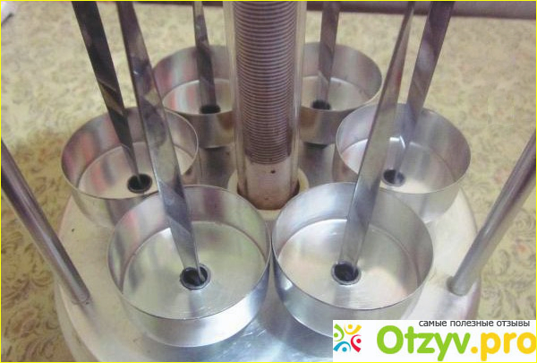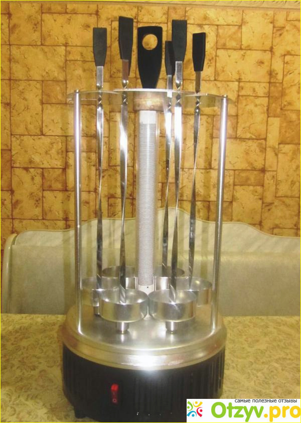 Кнопка выключение-включение расположена на корпусе и когда электрошашлычница включена, индикатор светится. Также имеется автоматизированное устройство, которое вращает шампура с нанизанным мясом во время приготовления, и таким образом оно нормально адекватно прожаривается, равномерно со всех сторон. При жарке мяса образуется большое количество жира, особенно, если это свинина. Установленные специальные под шампуры чашечки позволяют жиру туда стекать и таким образом шашлычница содержится в относительной чистоте от жира. Почему в относительной – все-равно при жарке жир в небольших количествах брызгает на стенки, и этого не избежать. Периодически конечно надо будет устройство приводить в порядок.