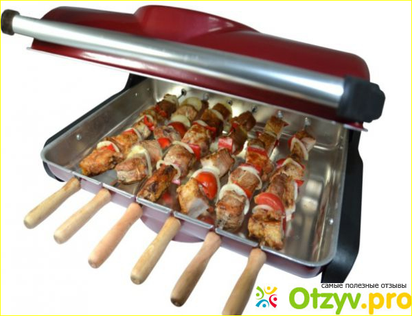 Занимает прибор совсем не много места, поэтому его можно легко брать с собой в поездки. В наборе к прибору вы найдете шесть шампуров и дополнительно есть решетка для гриля. В низу и прибора есть специальный поддон, куда будет стекать весь жир. Готовить на ней можно не только мясо, но и овощи, рыбу. Причем все это будет готовиться без капли дополнительного жира. В итоге вы получите не только вкусные, но еще и полезные блюда. На приготовления шашлыка с таким прибором у вас уйдет не больше двадцати минут.