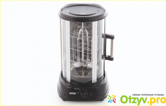 Работает устройство от обычной сети. С его помощью можно запечь вкусное мясо у себя на даче. Конструкция представляет собой нагревательный элемент, который расположен в центре, а по краям находятся шампура в количестве пяти штук. Эти штуковины автоматически вертятся, мясо пропекается равномерно. Под каждым из этих шампуров находится лоток, в который стекает выделяющийся жир. Все это закрыто дверцами, так что снаружи все выглядит красиво и опрятно. Створки закрываются на магнитный замок.