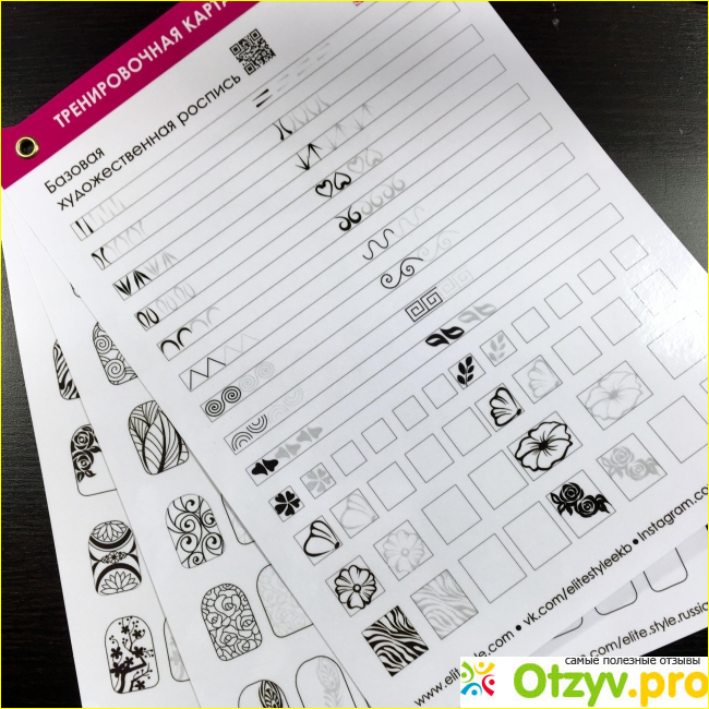 Тренинровочная карта, это своеобразный курс который начинается от простого к сложному. Здесь три листа, первый из которых представляет самые простые элементы рисунка, на втором они уже складываются во едино, и к третьему листу, мы уже начинаем создавать действительно сложные художественные дизайны. В столбце несколько клеток. Сначала образец, потом едва прорисованный контур, которому мы должны следовать и затем пустые клетки, в которых уже происходит рисование от руки. Я уделаля по 30-60 минут работе с картами ежедневно. И вот уже спустя два месяца , я включаю вензеля, и их элементы в свою работу. И это действительно довольно просто делается от руки, просто главное понять, как мы можем настраивать эти завитки один на другой. Я рада, что не заплатила 3000 рублей за курс в школе маникюра, и потратила всего 350 ! Рекомендую.