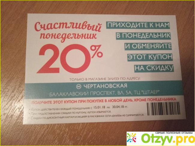 Также у них выдаются купоны на скидку. Понедельник у них "счастливый". По этому купону можно получить скидку на двадцать процентов.