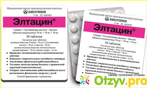 Элтацин является комбинированным средством, которое состоит из трех аминокислот. Среди них L-цистин, L-глутаминовая кислота, а также аминокислота глицин. Среди вспомогательных соединений в препарате имеется стеариновокислый магний, а также воднорастворимая метилцеллюлоза.