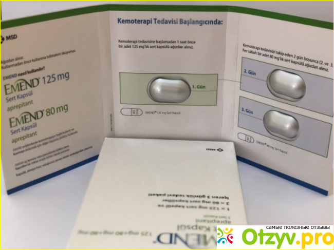 Описание препарата вполне понятно — противорвотное при химиотерапии. Так же четко и точно прописан план применения лекарства — исходя из того, что в пачке всего 3 таблетки. Их надо принимать как до, так и после проведения химиотерапии.