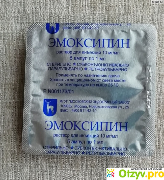 В последнее время стало "модным" всем подряд назначать препарат Эмоксипин, как в качестве инъекций для внутримышечного введения или внутривенного, так и для субконъюнктивального, парабульбарного (в качестве анестезии применяемый при операциях на глазах) или ретробульбарного введения (то есть включает введение лекарственного средства через кожу нижнего века в область нижнего бокового края орбиты).