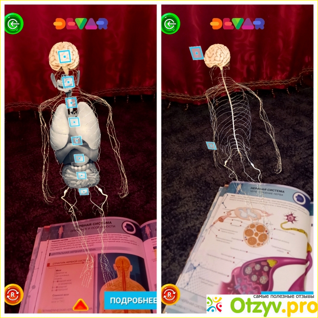 Все картинки можно увидеть с разных ракурсов. Для этого достаточно лишь повернуть страницу. А еще можно увидеть любой орган в разрезе и узнать из чего он состоит. Для этого существует специальная кнопка "Подробнее", нажав на которую вы сможете досконально все изучить.