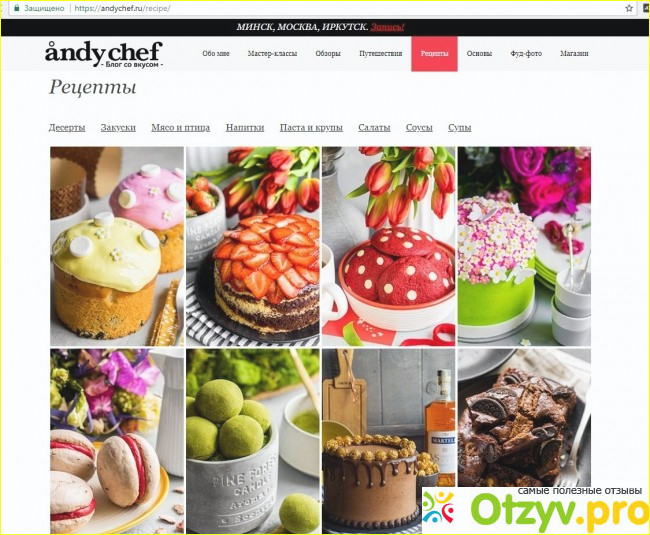 Выбрав то, что тебе необходимо, открывается новая страничка с точнейшим составом и количеством необходимых продуктов. Но самое главное впереди. Пошаговое приготовление десерта с отличными и качественными фотографиями и текстовым их сопровождением. Такие прекрасные рецепты во всех подразделах - о закусках, о мясе и птице, о напитках, про пасту и крупы, о салатах, соусах и супах. Раздел блога - обзоры, является чуть ли не энциклопедией. В нем Андрей делает обзоры не только на приборы, помогающие в кулинарии, но книги, различные вещи в общем все, что ему нравится. Он делится своим опытом эксплуатации того либо иного предмета, которым пользуется. В разделе мастер-классы, он выкладывает записи мастер-классов в которых участвует. В разделе путешествия, он рассказывает о том, как надо правильно путешествовать, о своих путешествиях, и рассказывает различные истории. Раздел основы, он посвящает рассказам о самых сложных и простых секретах и технике приготовления, дает маленькие советы и рассказывает, как надо работать с тем либо другим прибором и инструментом. В общем здесь тоже есть очень много полезной информации. Также Андрей создал раздел под названием фуд-фото. По моему мнению, это тоже очень важный и необходимый раздел. Это практически школа по фотографии. В нем есть четыре урока о том, как и чем лучше фотографировать приготовленную пищу. И еще один интересный раздел в блоге - это интернет-магазин. В нем предлагаются различные товары самых лучших брендов, а также есть возможность оплатить заказ тринадцатью способами и быстро его получить. Ассортимент товаров в интернет-магазине от разнообразных кондитерских форм и инвентаря до пищевых ингридиентов, кухонной техники, кондитерской упаковке, книг и журналов, подарочных сертификатов. Все представленные товары в магазине выбирались самим Андреем, после того как он использовал их на личном опыте. Поэтому, я думаю, что товары очень качественные и удобные в эксплуатации.