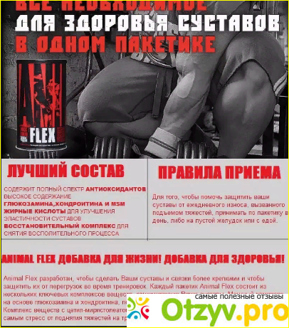 Animal Flex-это биологически активная добавка для людей, профессионально занимающихся тяжелыми видами спорта. Ее просто необходимо принимать тем спортсменам, связки и суставы которых оказываются в зоне большого риска травмирования при занятии спортом.