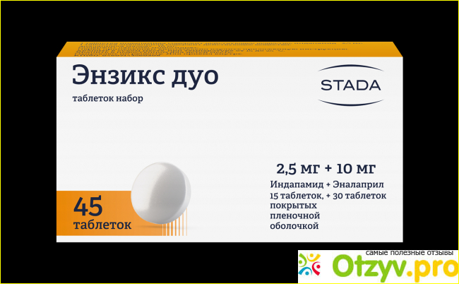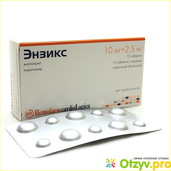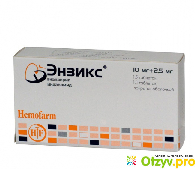 Энзикс содержит в составе два активных компонента: 10 мг малеата эналаприла +2,5 мг индапамида. Энзикс Дуо: 10 мг малеата эналаприла + 2,5 мг индапамида; Энзикс Дуо Форте: по 20 мг малеата эналаприла +2,5 мг индапамида. Такое сочетание дает двойной эффект и помогает быстрее купировать симптоматику. Препарат относится к антигипертензивным средствам, одно вещество: эналаприл относится к ингибиторам ангиотензинпревращающего фермента. Второе вещество – индапамид – это диетическое вещество или просто мочегонный препарат. Оба вещества вместе взаимодействуют, слаженно работают, одно вещество эффективно снижает артериальное давление, снижает общее периферическое сосудистое сопротивление, регулирует работу сердечного миокарда, при этом не оказывает сильного воздействия на частоту сердечных сокращений. После резкого прекращения приема препарата синдрома отмены не наблюдается.