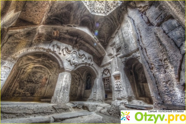 Очень интересным памятником является Гехард. Гехард - храм, высеченный в скале. Фасад отделан искусной резьбой по камню. Внутри храм имеет 2 этажа, акустика зала второго этажа необыкновенная. Перед храмом есть место жертвоприношений. Вся площадка комплекса Гехард выложена каменными плитами, есть здесь и характерные только для Армении каменные кресты (хачкары) с замечательными орнаментами.