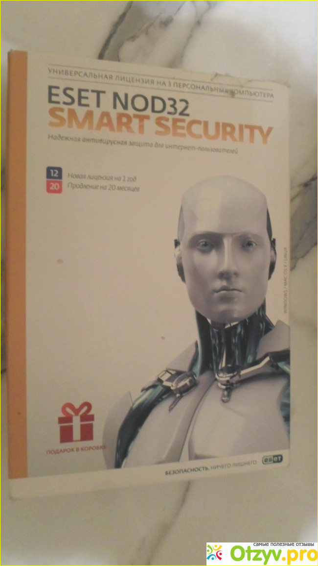 Мне очень не понравилась такая не качественная антивирусная программа и я другим не посоветую за такие деньги и столько головных болей. Упакована Еset Nod 32 Smart Sekurity антивирусная программа там просто тонкий жёсткий диск и несколько инструкций по эксплуатации и универсальная лицензия на три персональных компьютера уложены в картонную большую коробку. А так же продление на 20 месяцев которого не было. На картинке коробки красивый робот и подарок в коробке я не видела. Диски изготовлены в России: ООО "Мастер - М", Москва.