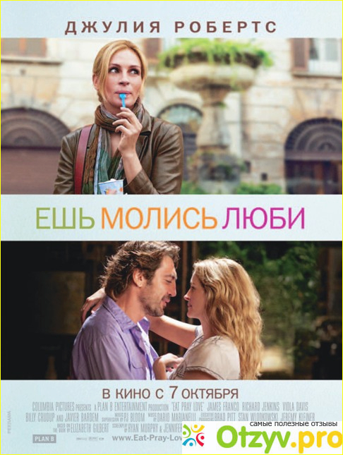 "Фильм Ешь, Молись, люби" является экранизацией нашумевшего романа-автобиографии писательницы Элизабет Гилберт. Вышел этот фильм в прокат в 2010 году и перед его выходом было очень много рекламы, постеров. Привлекательным был не только сюжет, но и так же шикарнейший актёрский состав.