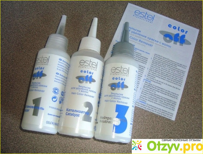 Покупая смывку ESTEL color off, можно заметить, что в комплект входит три бутылочки, каждая из которых объёмом по сто двадцать миллилитров. Среди них катализатор, восстановитель и нейтрализатор. Катализатор - это белая, кремообразная смесь. Восстановитель имеет подобную текстуру и цвет, только плюс ко всему он имеет резкий запах. Нейтрализатор имеет жидкую консистенцию и чем-то напоминает бальзам для волос.