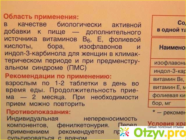Согласно описанию, данный препарат содержит в себе растительные экстракты плодов витекса священного, корневища с корнями диоскореи, экстракт семян сои, являющаяся источником витаминов (В6, Е, К1, фолиевой кислоты), бора, изофлавонов, гидрокситриптофана, индол-3-карбинола, диосгенина и аукубина. Такой внушительный список активных веществ не может не впечатлить и на первый взгляд может показаться, что этот волшебный препарат действительно может помочь избавиться от многих проблем.