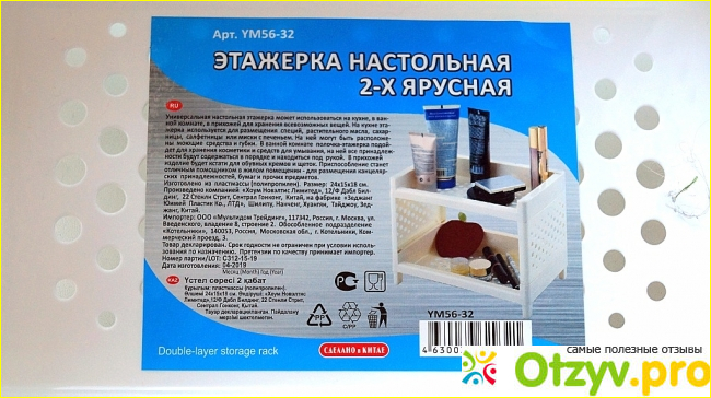 Сама по себе этажерка очень легкая, вес её составляет 0,272 кг. Размеры её в сборе: длина: 24 см, ширина:15 см, высота: 7,5 см. Эта этажерка 2-х ярусная, то есть имеет две полки. Нижняя полка ограничена по высоте, а верхняя нет. Полочки, как нижняя, так и верхняя имеет бортики, так что предметы, находящиеся там не выпадут. Этажерка настольная, то есть её можно поставить на любую поверхность. Для этого у неё есть небольшие ножки без всяких заусенец, так что поверхность стола, куда вы поставите данную этажерку, не поцарапаются. Эта покупка пришлась по душе моей жене. Думаю, что она востребована не только в нашей семье. Её достоинства следующие: