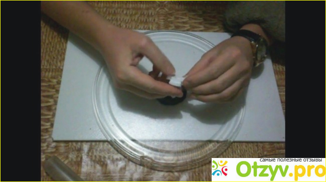 В общем, закончив с "очисткой" поверхности поддона, взялась устанавливать ее в СВЧ. Устанавливать - это, конечно, громкое слово, так как я просто взяла и поместила ее в крестовину - ничего сложного. "Села" она как влитая, за что спасибо моему мужу, который правильно все измерил.