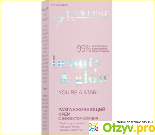 С недавних пор мне посоветовали новую линейку от известного бренда EVELINE- beauty & glow YOU'RE A STAR! Это крем с разглаживающим эффектом, а как дополнение ещё и с сияющим блеском. Приобрести его гораздо проще, так как им активно торгуют на таких площадках, как Вайлдберриз и Озон. Ёмкость крема в тюбике составляет 75 миллилитров, и он подходит для любых типов кожи. Цена на момент приобретения летом прошлого года составляла 270 рублей. Крем производится в Польше.