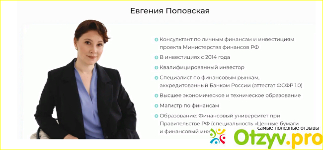 Ну что могу сказать про курс "Школа инвестора" и про саму Евгению Поповскую? Наверное то, что она является одним из лучших онлайн-курсов по инвестированию, который позволяет студенту получить всю полезную информацию и навыки, чтобы принимать правильные решения на финансовом рынке. Если вы ищете надежный и профессиональный курс, который поможет вам расширить свои знания в области инвестирования, то "Школа инвестора" – это то, что вам нужно. Обяхательно обратите внимание на эту даму и на ее курсы, уверена на все 100%, что вы не пожалеете. Если хотите, то изучите отзывы в интернете – их там очень много, и в большинстве случаев они положительные.