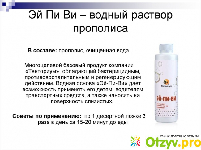 Таким образом, спектр воздействия «Эй-Пи-Ви» довольно широк. Недаром водный экстракт прополиса является залогом здоровья.