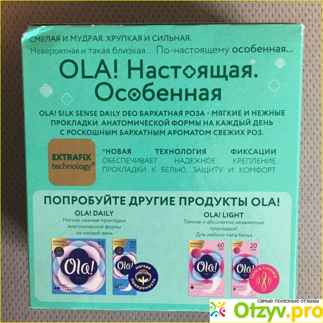 К ежедневным прокладкам у меня есть три главных требования: отличная впитываемость, не раздражающая кожу поверхность и качественная клейкая основа. Все это я нашла в прокладках Ола. Покупаю ароматизированные, с розой, аромат очень тонкий, не удушающий.