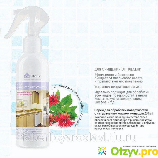 Конечно всем известно, что иногда на кухонных и поверхностях ванной комнаты возникают плесневые образования.( черные разводы), так же и на окнах и так далее.. Эта плесень очень опасна для здоровья и от неё надо избавляться. Я приобрела Фаберлик Спрей для обработки поверхностей от спор плесневых грибов с маслом Монарды.