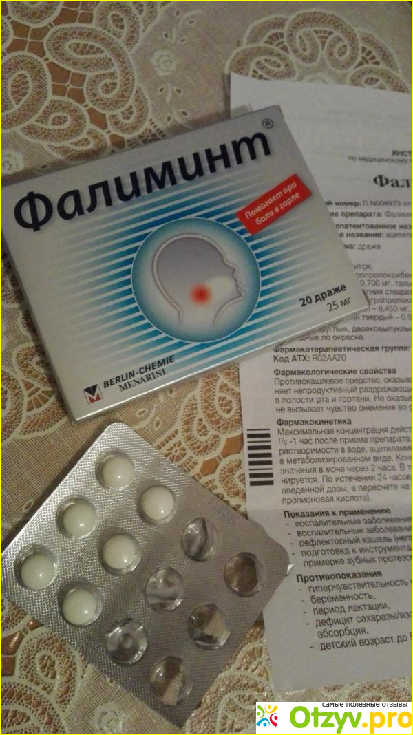 Не вижу смысла обсуждать химический состав, фармакокинетику препарата, лучше поговорить о показаниях. Фалиминт показан при боли в горле, при рассасывании таблетки (драже) почти сразу ощущается снижение боли в горле и облегчение дыхания, прекращается рефлекторный кашель Кроме того, Фалиминт обладает противовоспалительными свойствами, то есть не только снимает симптомы, но и лечит горло, плюс разжижает слизь, что облегчает отхаркивание всякой скопившейся внутри грязи. К плюсам препарата стоит отнести и то, что он не сушит слизистую и не вызывает онемения рта, как это бывает у препаратов , которые содержать анестезин (к примеру Альмагель-А). Еще одной особенностью Фалиминта является то, что он притупляет рвотный рефлекс, что можно использовать при прохождении медицинских процедур типа изучения кислотности.