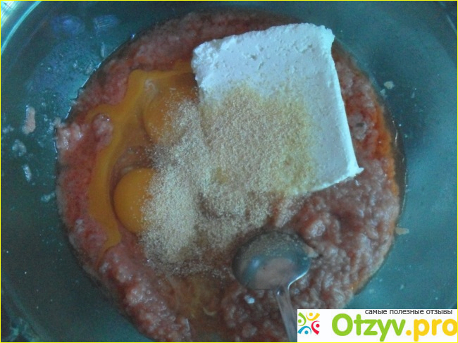 На фото полкило фарша, два яйца, 180 грамм творога, гранулированный чеснок. Сюда еще добавляю 3 чайные ложки цельнозерновой муки, 3 столовые ложки пшеничных отрубей, соль .
