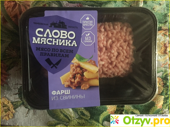 Фарш из свинины от Слово мясника. Упакован в пластиковую черную ванночку. Вся информация присутствует на упаковке (производитель, состав, дата производства, название)