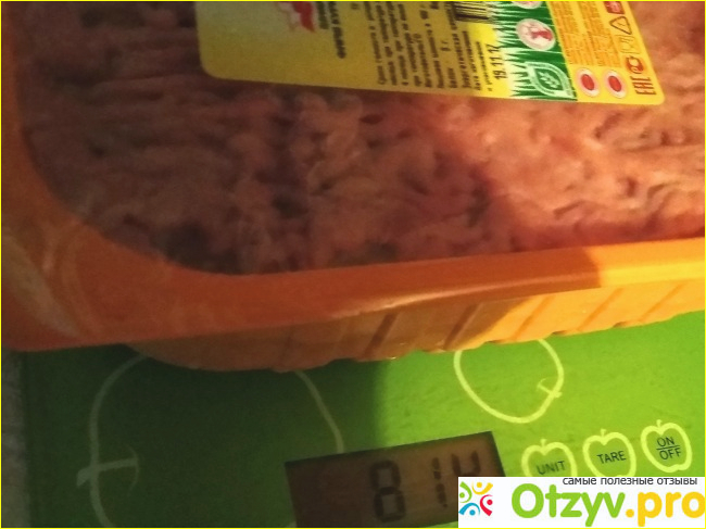 Очень порадовал этот факт. После разморозке в фарше появилась красная водичка. Это не беда, и её не много. Вполне естественное количество для фарша. В упаковке должно быть 800 грамм, проверила на веса – 814, не обманули, за 72 рубля, т. е. 90 рублей будет килограмм.