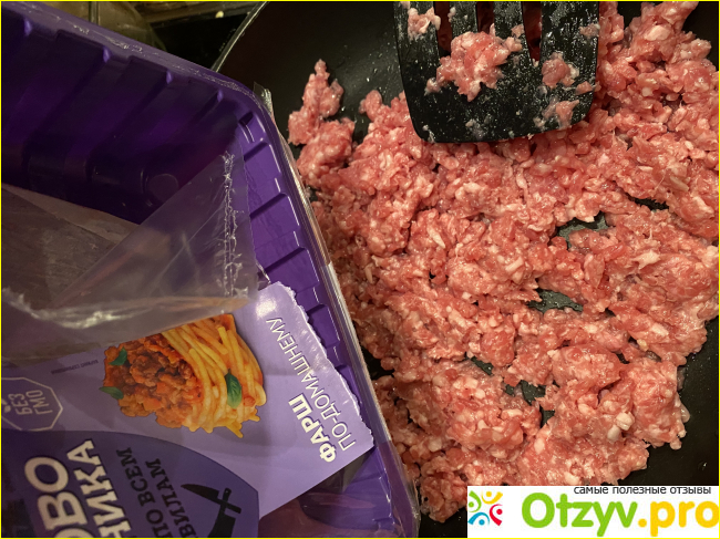 Вес одного лотка составляет примерно 450 грамм, цена 157 рублей. На упаковке указано, что фарш состоит из двух частей - свинина и говядина. Согласно упаковке, внутри фарша всего два вида мясо, и не более. Фарш хорошо лепится к рукам, он не жирный, очень свежий. Фарш ужаривается, но не сильно. Одного лотка такого фарша хватает на одно полноценное блюдо.