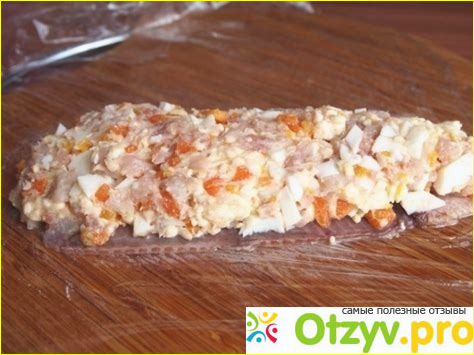 Выкладываем начинку на половинку и прикрываем второй половинкой. Аккуратно заворачиваем пищевой пленкой в рулет и отправляем в холодильник на 2 часа.