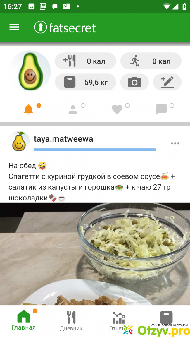 Из плюсов - можно общаться с другими худеющими, выкладывать свои достижения, фото блюд и т. д., для этого есть чат. Это помогает и мотивирует ( хотя я не общалась). Достаточно большой список продуктов и блюд, а если искомого нет, можно внести, указав название и калорийность. Удобный интерфейс, доступность ( приложение бесплатное).