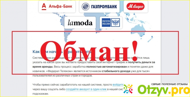Названия на сайте используются известные, которые вероятней всего вызовут доверие у пользователя. Билайн, Сбербанк, Газпромбанк. Эти корпорации настолько огромны, что, конечно, им нужно много трафика, сомнений в этом не возникает. Плюс достаточно богаты, чтобы не скупясь заплатить за интернет. Само название проекта тоже созвучно с известными фирмами. Поэтому человеку кажется, что проект на слуху, известен.