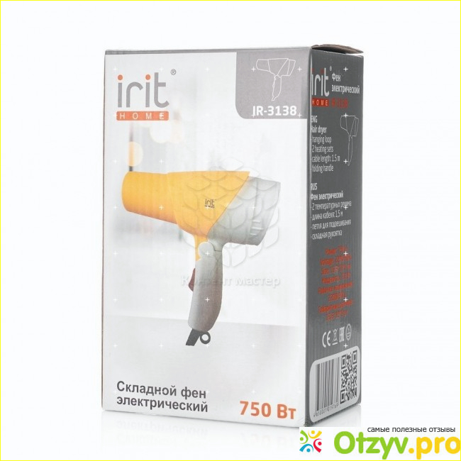 Выбрала я, по совету продавца-консультанта, модель Irit IR-3138. Стоил он совсем копейки. что-то около 380 рублей. Но при этом он довольно мощный. Мои длинные волосы он сушит довольно быстро. У него есть два режима нагрева. но я обычно пользуюсь самым мощным, чтобы быстрее просушить свои волосюшки. Шнур у него довольно длинный не надо крутиться около розетки. Так как розетки рядом с зеркалом бывают далеко не везде. Сам фен очень легкий и компактный, влезает даже в мой небольшой дорожный саквояж.