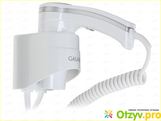 Galaxy GL4350 обладает мощностью в 1400 Вт, также задействованы два режима регулировки потока воздуха, есть функция "холодный воздух", съемная защитная решетка. Сам корпус фена выполнен из хорошего качественного пластика бело-серебристого цвета, оснащен креплением на стену.