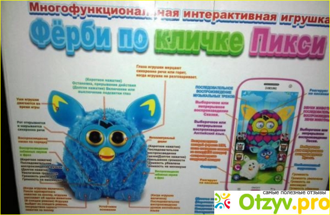 Все имеющиеся функции написаны на коробке. Есть в игрушке интелектуальный диалог, чувствительность к касаниям, ответы на вопросы. Этот Ферби показался нам более разговорчивым и всё у него со смыслом.