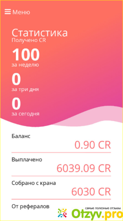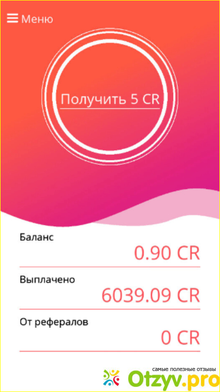 В разделе "Рефералы" размещается ваш реферальный код, который нужно распространить чтобы получить приятные бонусы. Каждый человек, который указал при регистрации в приложении ваш реферальный код, получит бонус 100 CR. А от каждого сбора реферала с крана вы получите 10% прибыли.