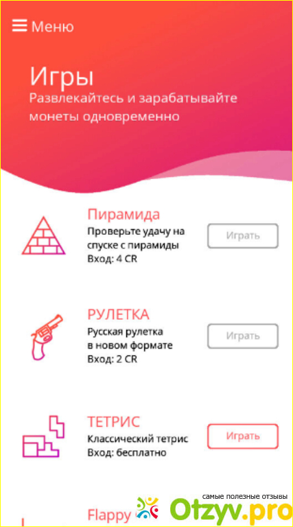 Игры бывают платные и бесплатные. Платные - это пирамида и рулетка, бесплатные - тетрис, flappy coin, jumping fun. Из этих всех игр я играла только в тетрис. За игры также начисляются баллы только очень мало.