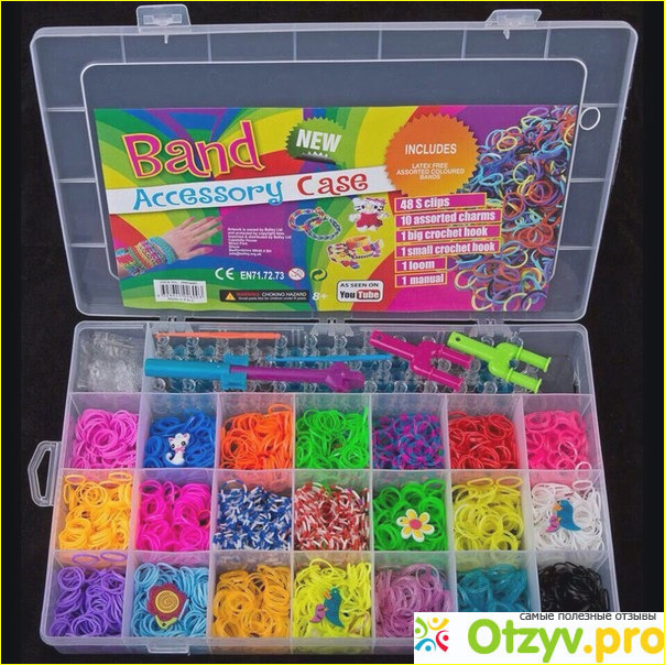 Мы купили простой набор из резиночек. Обычно в него входят : цветные резиночки, несколько цветом, вилка (на которой можно плести), реже сам станок, а еще входят бусинки, подвески.