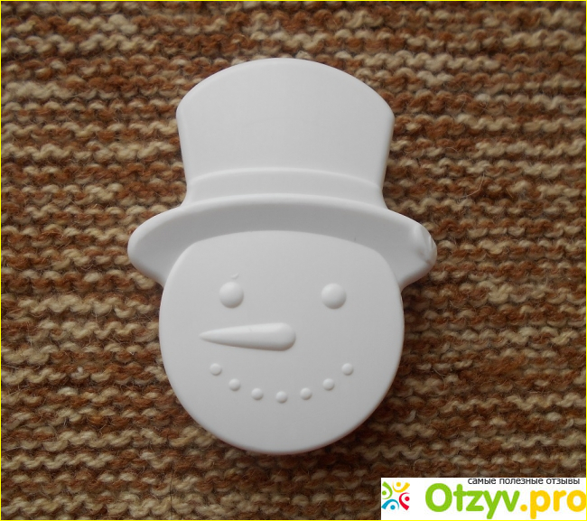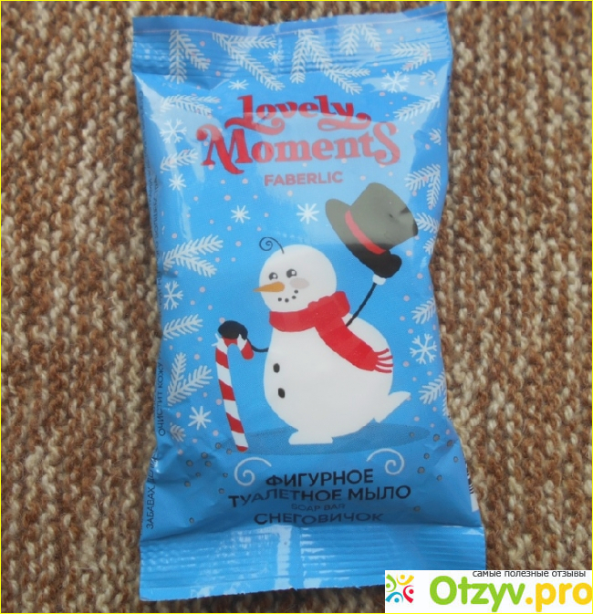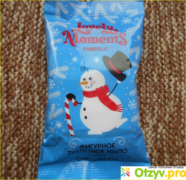 После открытия обертки я обнаружила миниатюрное мыло. Оно не очень похоже на снеговика с обертки. Рот снеговика прорисован прерывистыми черточками. Средство для гигиены похоже даже не на снеговика, а на будильник-снеговик. Но мыло само по себе замечательное – душистое, мылится не чрезмерно, хорошо смягчает кожу рук.